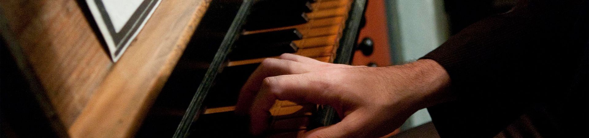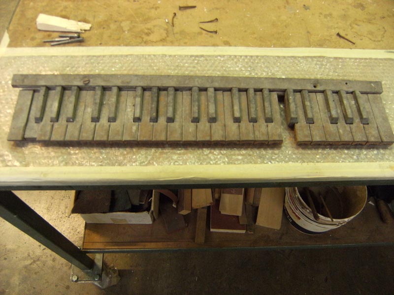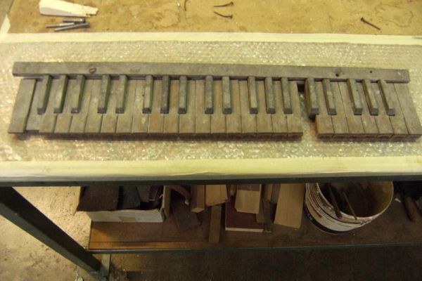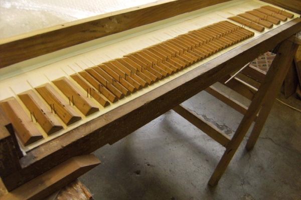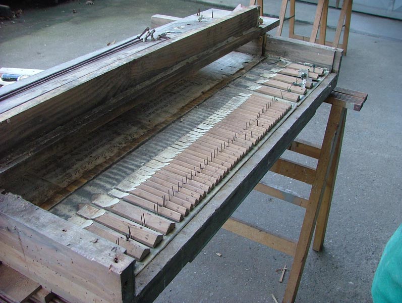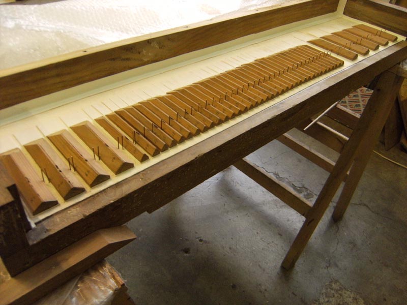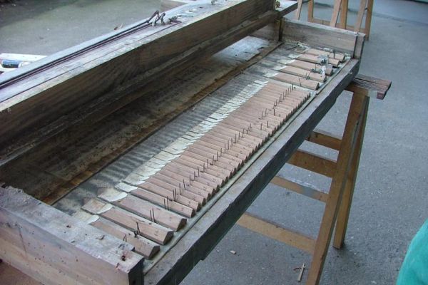 – Prime note (Do 1 – Fa#2) in legno d’abete tappate, di cui 7 poste su trasporti, ai fianchi della cassa, le restanti direttamente sul somiere.