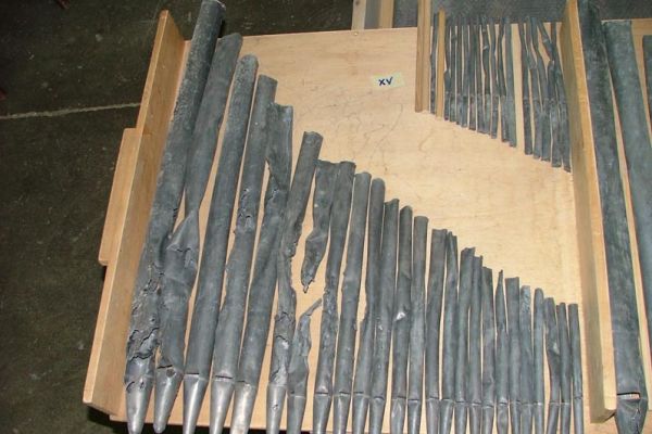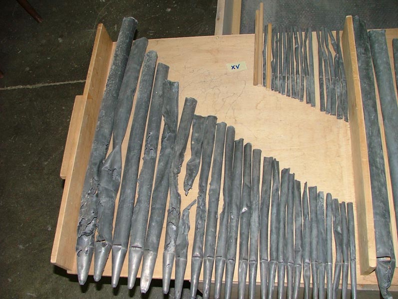 – lastre di piombo molto fini lavorate al laminatoio dagli spessori che variano dai: per le canne più grandi di 05/06 mm, fino a toccare nelle più sottili gli spessori di 02/03mm,