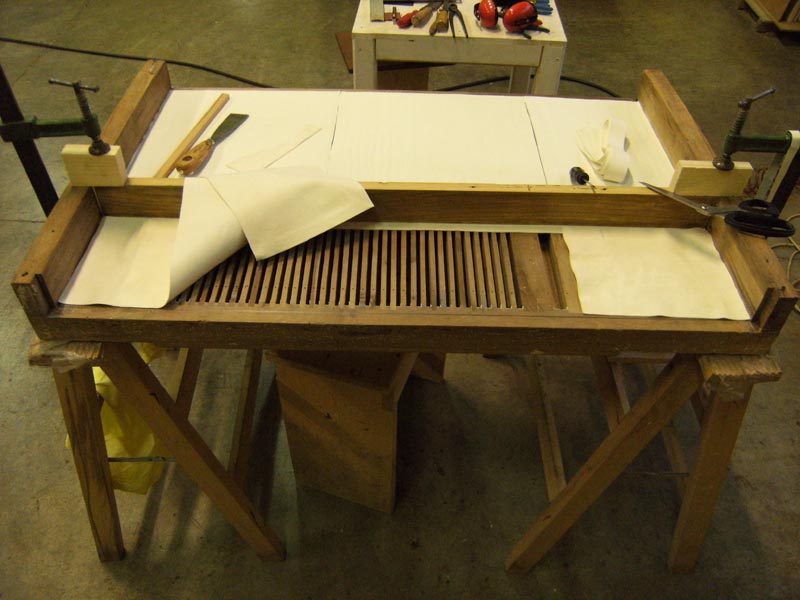 Il somiere è del tipo a tiro in legno di noce scuro, con 45 canali. I ventilabri sono in legno d’abete numerati a china sul fianco destro, secondo l’ordine numerico da sinistra verso destra (1 – 45). Hanno guide laterali in ottone e l’impellatura e doppia (pelle e contro pelle al somiere). La chiusura dei canali inferiori è tramite stecche di legno di noce e una copertura esterna di pelle, la chiusura del somiere nella parte anteriore, è mediante un’unica anta ad incasso impellata. Il fondo della secreta è in legno di pioppo. Le stecche dei registri scorrono in apposite guide falsestecche in noce e poggiano direttamente sul piano del somiere, nel quale è presente un fitto reticolo di solchi scavati che fungono da “scappamenti” per l’aria. Allo smontaggio il somiere si trovava in condizioni di conservazione pessime, erano evidenti i segni dell’acqua e dell’umidità, tanto che la colla delle giunture e degli incastri era totalmente ceduta; si è inoltre dovuto far fronte ad un notevole problema di “imbarcamento” del legno che ha comportato la messa in trazione del manufatto per diversi giorni. La presenza del tarlo era inoltre piuttosto consistente. Come già affermato, il piano inferiore del somiere era stato coperto con carta da musica. L’interessante manoscritto, è stato attentamente rimosso tramite l’utilizzo di acqua calda e vapore. I manoscritti sono stati appoggiati sopra pannelli in legno e asciugati. Si è quindi passati allo smontaggio del somiere che, come detto era completamente scollato. Ogni parte è stata quindi scorporata ad eccezione del montante principale e la relativa coperta. Dopo lo smontaggio si è proceduto ad un accurato trattamento antiparassitario, mediante antitarlo professionale a base di permetar. La pulizia di tutte le parti lignee è avvenuta senza l’utilizzo di materiali abrasivi o acidi, ma solamente tramite frizioni con Alcool a 99,9% e l’utilizzo di lana a leggerissima abrasione (0000) e gomme, questo ha permesso di mantenere inalterata la superficie dei legni e la lettura delle originali scritte o incisioni ove presenti. È seguita una accurata stuccatura e isolamento di tutti i fori del tarlo e delle crepe tramite colla a caldo e polvere di legno. Le parti “imbarcate” sono state sottoposte e trazione per alcuni giorni e quindi sono state rincollate e assemblate a regola d’arte tramite colla animale a caldo. Tutte le pelli del somiere: piani, ventilabri, coperta inferiore etc, sono state sostituite con nuova pelle bianca d’agnello a concia naturale. Si sottolinea che né le coperte, né il piano del somiere ha subito alcuna abrasione o trattamento di spianatura meccanica. Si è lavorato accuratamente al livellamento delle stecche e delle false stecche mediante l’aggiunta, ove necessario, di piccolissimi spessori, in modo da ottenere un’ottimale tenuta dei registri, senza alterazioni al manufatto originale. Tutti i chiodi in ferro forgiato, che erano stati rimossi dalla coperta, sono stati conservati, puliti, raddrizzati e ricollocati al loro posto. Il crivello di sostegno delle canne è in legno di pioppo di spessore 08 mm. La sua struttura è semplice, priva di telaio e sorretta da tronchetti ad incastro in legno di noce e ancorata alla parte interna frontale della cassa. Lo stesso risultava mancante di una grossa parte sul fronte. Fortunatamente tutti i frammenti erano stati recuperati e, come un puzzle è stato ricomposto, risultando di fatto mancante solamente di una piccolissima porzione. L’assemblaggio dei frammenti è stato effettuato tramite colla a caldo e l’applicazione, nella parte inferiore di piccoli tasselli di legno nuovo, sempre in pioppo, successivamente forato e adattato alla perfezione. Durante tutte le fasi è stata prestata la massima attenzione a non cancellare le segnature e le numerazioni a china presenti, che risultano tuttora perfettamente leggibili. I piedini di sostegno ad incastro sono stati collocati nella medesima posizione d’origine.