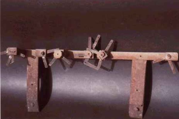 I collegamenti trovati erano in filo di ferro, ma la provvidenziale sopravvivenza di un collegamento del Tamburo costituito da una fettuccia di legno con agganci d’ottone alle estremità e guarnita con una striscia di pergamena uguale a quella presente sul Do 1 dei Contrabbassi (ambedue con scritte a penna antiche della stessa mano) ci ha orientato verso la ricostruzione di tutti i collegamenti con fettucce di legno simili.