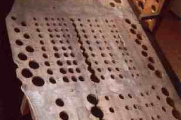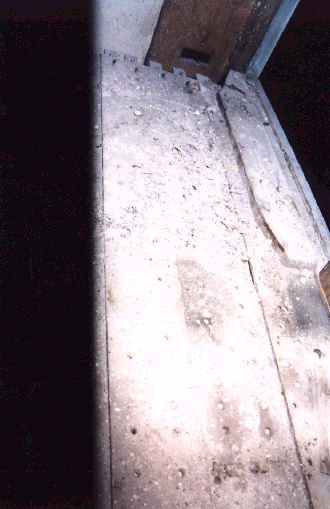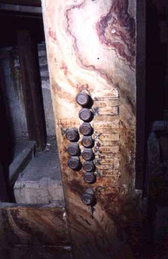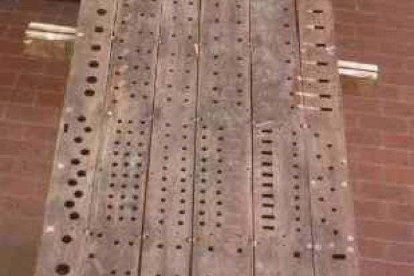 Già nel 1702 Crisostomo Fontana dovette smontare l’organo per “raggiustare” il bancone “che aveva patito”[4] e probabilmente proprio a lui sono da attribuire le stuccature e gli innesti di noce trovati sui listelli. Ma ciò non deve essere stato sufficiente, visto che la cintura anteriore del somiere era stata forata in 10 canali e che 2 gruppi di 3 canali contigui, per un totale di 6, erano stati ispezionati da sotto scalpellando i coperchi richiusi poi con toppe di pelle.